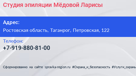 Студия эпиляции Мёдовой Ларисы по адресу Ростовская область, Таганрог, Петровская, 122 в дальнейшем Организация, размещена в следующих категориях: