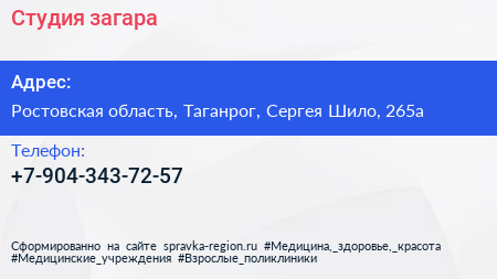 Студия загара по адресу Ростовская область, Таганрог, Сергея Шило, 265а в дальнейшем Организация, размещена в следующих категориях: