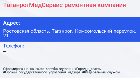 ТаганрогМедСервис, ремонтная компания по адресу Ростовская область, Таганрог, Комсомольский переулок, 21 в дальнейшем Организация, размещена в следующих категориях: