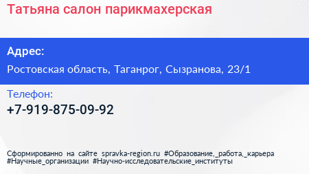 Татьяна, салон-парикмахерская по адресу Ростовская область, Таганрог, Сызранова, 23/1 в дальнейшем Организация, размещена в следующих категориях: