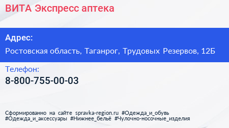 ВИТА Экспресс, аптека по адресу Ростовская область, Таганрог, Трудовых Резервов, 12Б в дальнейшем Организация, размещена в следующих категориях: