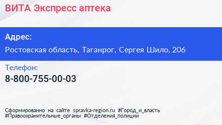 ВИТА Экспресс, аптека по адресу Ростовская область, Таганрог, Сергея Шило, 206 в дальнейшем Организация, размещена в следующих категориях: