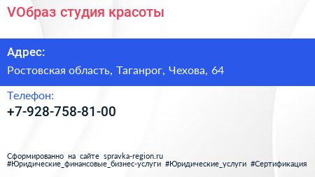 VОбраз, студия красоты по адресу Ростовская область, Таганрог, Чехова, 64 в дальнейшем Организация, размещена в следующих категориях: