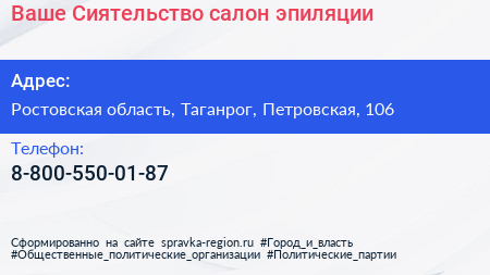 Ваше Сиятельство, салон эпиляции по адресу Ростовская область, Таганрог, Петровская, 106 в дальнейшем Организация, размещена в следующих категориях:
