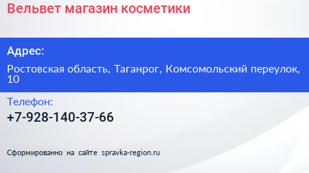 Вельвет, магазин косметики по адресу Ростовская область, Таганрог, Комсомольский переулок, 10 в дальнейшем Организация, размещена в следующих категориях:
