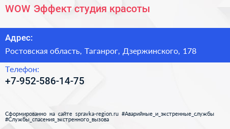 WOW Эффект, студия красоты по адресу Ростовская область, Таганрог, Дзержинского, 178 в дальнейшем Организация, размещена в следующих категориях: