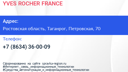 YVES ROCHER FRANCE по адресу Ростовская область, Таганрог, Петровская, 70 в дальнейшем Организация, размещена в следующих категориях: