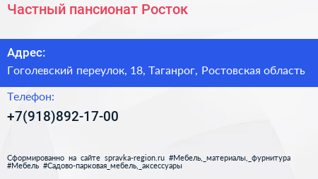 Частный пансионат «Росток» по адресу Гоголевский переулок, 18, Таганрог, Ростовская область в дальнейшем Организация, размещена в следующих категориях: