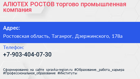 АЛЮТЕХ-РОСТОВ, торгово-промышленная компания по адресу Ростовская область, Таганрог, Дзержинского, 178а в дальнейшем Организация, размещена в следующих категориях: