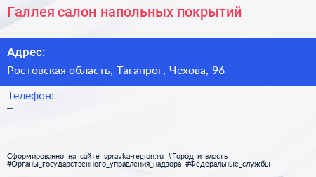 Галлея, салон напольных покрытий по адресу Ростовская область, Таганрог, Чехова, 96 в дальнейшем Организация, размещена в следующих категориях: