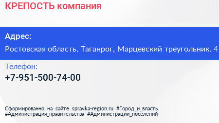 КРЕПОСТЬ, компания по адресу Ростовская область, Таганрог, Марцевский треугольник, 4 в дальнейшем Организация, размещена в следующих категориях: