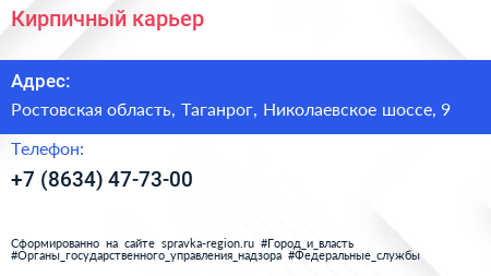 Кирпичный карьер по адресу Ростовская область, Таганрог, Николаевское шоссе, 9 в дальнейшем Организация, размещена в следующих категориях: