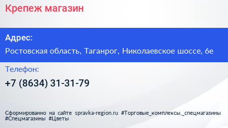 Крепеж, магазин по адресу Ростовская область, Таганрог, Николаевское шоссе, 6е в дальнейшем Организация, размещена в следующих категориях: