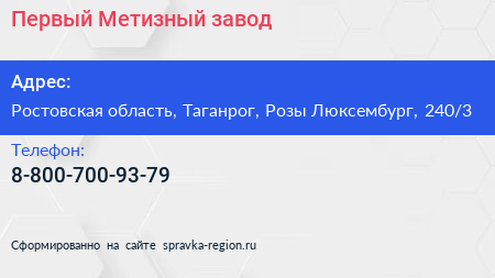 Первый Метизный завод по адресу Ростовская область, Таганрог, Розы Люксембург, 240/3 в дальнейшем Организация, размещена в следующих категориях: