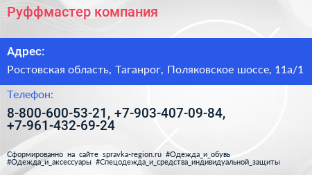 Руффмастер, компания по адресу Ростовская область, Таганрог, Поляковское шоссе, 11а/1 в дальнейшем Организация, размещена в следующих категориях: