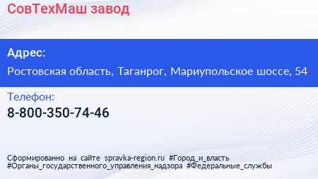 СовТехМаш, завод по адресу Ростовская область, Таганрог, Мариупольское шоссе, 54 в дальнейшем Организация, размещена в следующих категориях: