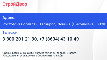 СтройДвор по адресу Ростовская область, Таганрог, Ленина (Николаевка), 309п в дальнейшем Организация, размещена в следующих категориях:
