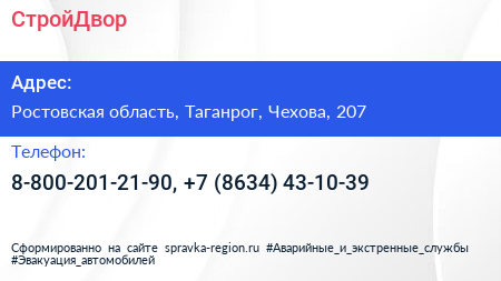 СтройДвор по адресу Ростовская область, Таганрог, Чехова, 207 в дальнейшем Организация, размещена в следующих категориях: