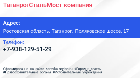 ТаганрогСтальМост, компания по адресу Ростовская область, Таганрог, Поляковское шоссе, 17 в дальнейшем Организация, размещена в следующих категориях: