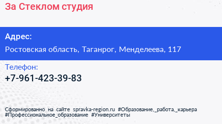 За Стеклом, студия по адресу Ростовская область, Таганрог, Менделеева, 117 в дальнейшем Организация, размещена в следующих категориях: