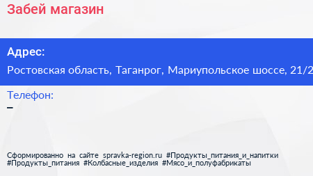 Забей, магазин по адресу Ростовская область, Таганрог, Мариупольское шоссе, 21/2 в дальнейшем Организация, размещена в следующих категориях: