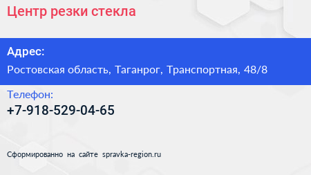 Центр резки стекла по адресу Ростовская область, Таганрог, Транспортная, 48/8 в дальнейшем Организация, размещена в следующих категориях: