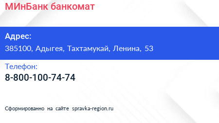 МИнБанк, банкомат по адресу 385100, Адыгея, Тахтамукай, Ленина, 53 в дальнейшем Организация, размещена в следующих категориях: