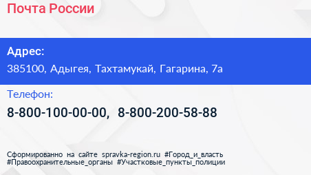 Почта России по адресу 385100, Адыгея, Тахтамукай, Гагарина, 7а в дальнейшем Организация, размещена в следующих категориях:
