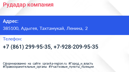 Рудадар, компания по адресу 385100, Адыгея, Тахтамукай, Ленина, 2 в дальнейшем Организация, размещена в следующих категориях: