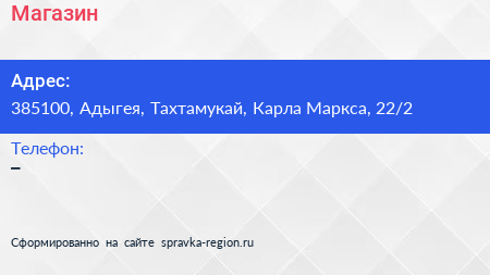 Магазин по адресу 385100, Адыгея, Тахтамукай, Карла Маркса, 22/2 в дальнейшем Организация, размещена в следующих категориях: