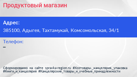 Продуктовый магазин по адресу 385100, Адыгея, Тахтамукай, Комсомольская, 34/1 в дальнейшем Организация, размещена в следующих категориях: