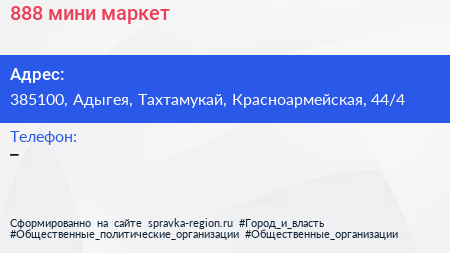 888, мини-маркет по адресу 385100, Адыгея, Тахтамукай, Красноармейская, 44/4 в дальнейшем Организация, размещена в следующих категориях: