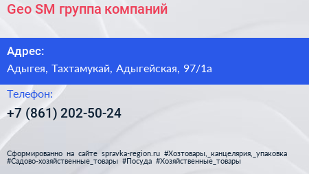 Geo SM, группа компаний по адресу Адыгея, Тахтамукай, Адыгейская, 97/1а в дальнейшем Организация, размещена в следующих категориях: