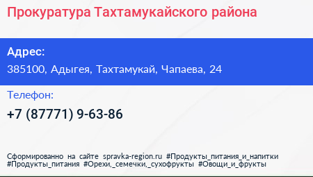 Прокуратура Тахтамукайского района по адресу 385100, Адыгея, Тахтамукай, Чапаева, 24 в дальнейшем Организация, размещена в следующих категориях: