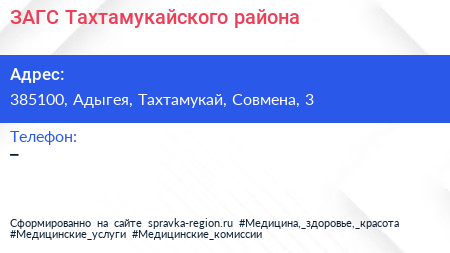 ЗАГС Тахтамукайского района по адресу 385100, Адыгея, Тахтамукай, Совмена, 3 в дальнейшем Организация, размещена в следующих категориях: