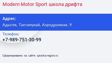 Modern Motor Sport, школа дрифта по адресу Адыгея, Тахтамукай, Аэродромная, 9 в дальнейшем Организация, размещена в следующих категориях: