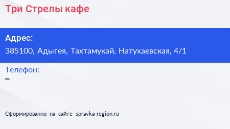 Три Стрелы, кафе по адресу 385100, Адыгея, Тахтамукай, Натухаевская, 4/1 в дальнейшем Организация, размещена в следующих категориях: