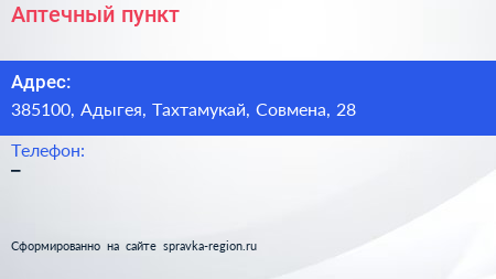 Аптечный пункт по адресу 385100, Адыгея, Тахтамукай, Совмена, 28 в дальнейшем Организация, размещена в следующих категориях: