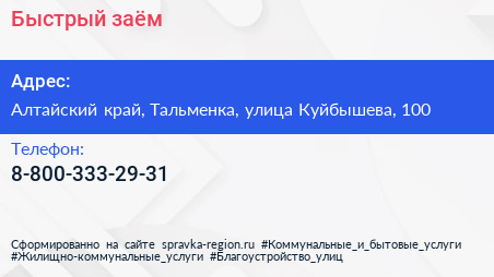 Быстрый заём по адресу Алтайский край, Тальменка, улица Куйбышева, 100 в дальнейшем Организация, размещена в следующих категориях: