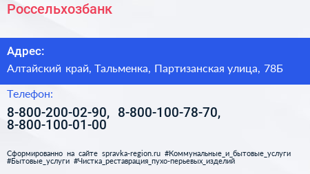 Россельхозбанк по адресу Алтайский край, Тальменка, Партизанская улица, 78Б в дальнейшем Организация, размещена в следующих категориях: