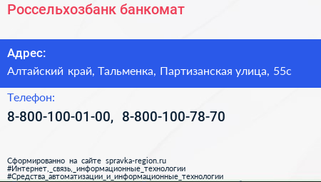 Россельхозбанк, банкомат по адресу Алтайский край, Тальменка, Партизанская улица, 55с в дальнейшем Организация, размещена в следующих категориях: