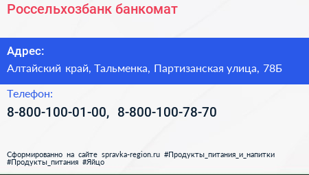 Россельхозбанк, банкомат по адресу Алтайский край, Тальменка, Партизанская улица, 78Б в дальнейшем Организация, размещена в следующих категориях: