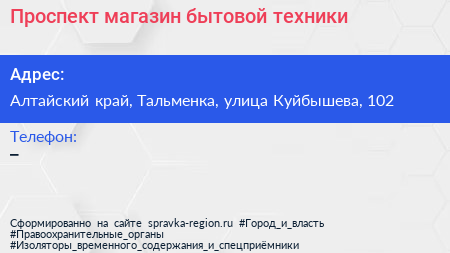 Проспект, магазин бытовой техники по адресу Алтайский край, Тальменка, улица Куйбышева, 102 в дальнейшем Организация, размещена в следующих категориях: