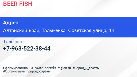 BEER & FISH по адресу Алтайский край, Тальменка, Советская улица, 14 в дальнейшем Организация, размещена в следующих категориях: