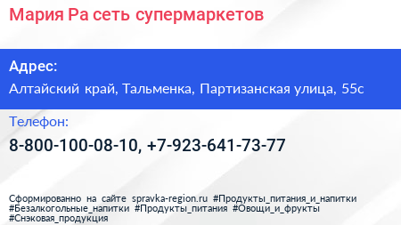 Мария-Ра, сеть супермаркетов по адресу Алтайский край, Тальменка, Партизанская улица, 55с в дальнейшем Организация, размещена в следующих категориях: