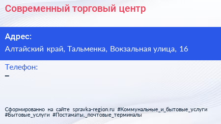 Современный, торговый центр по адресу Алтайский край, Тальменка, Вокзальная улица, 16 в дальнейшем Организация, размещена в следующих категориях: