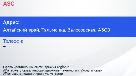 АЗС по адресу Алтайский край, Тальменка, Залесовская, АЗС3 в дальнейшем Организация, размещена в следующих категориях: