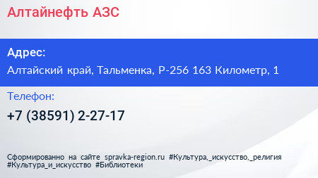 Алтайнефть, АЗС по адресу Алтайский край, Тальменка, Р-256 163 Километр, 1 в дальнейшем Организация, размещена в следующих категориях: