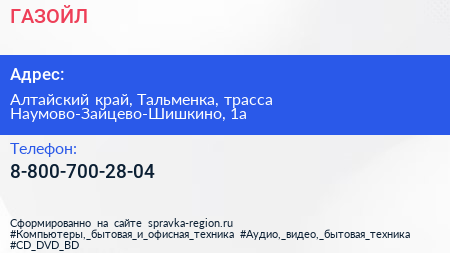 ГАЗОЙЛ по адресу Алтайский край, Тальменка, трасса Наумово-Зайцево-Шишкино, 1а в дальнейшем Организация, размещена в следующих категориях: