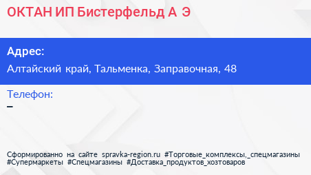 ОКТАН, ИП Бистерфельд А.Э. по адресу Алтайский край, Тальменка, Заправочная, 48 в дальнейшем Организация, размещена в следующих категориях: